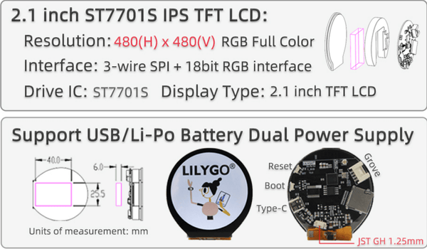 T-RGB is the first circular touch display screen of LilyGo. The screen uses a 2.1/2.8inch ST7701S TFT LCD full-color display.